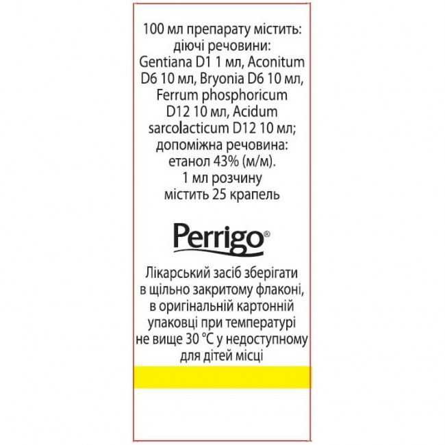 | Ingredients | Acidum sarcolacticum D12, Aconitum D6, Bryonia D6, Ferrum phosphoricum D12, Gentiana D1 |