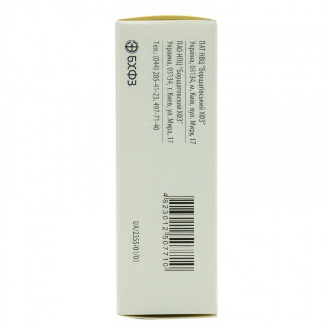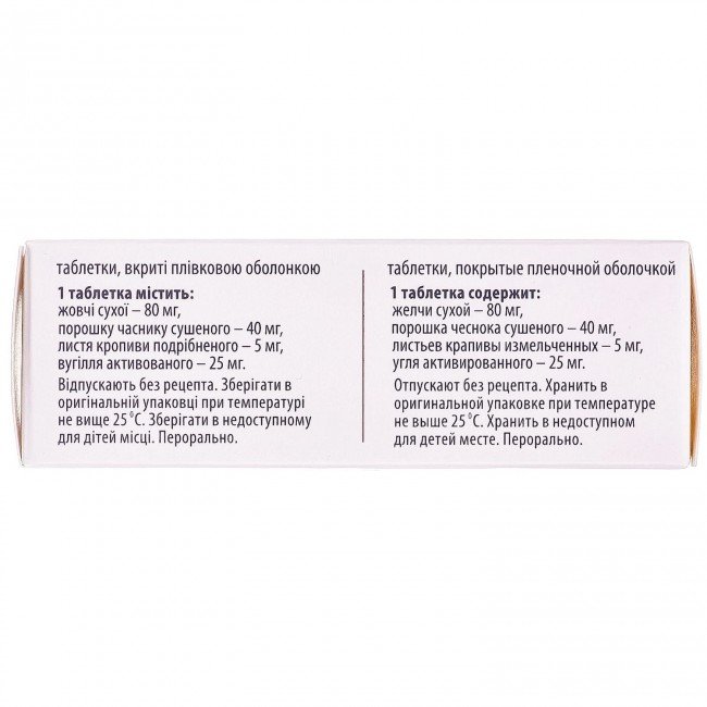 | Ingredients | 1 tablet contains dry bile (in terms of dry matter and quantitative composition of cholic acid) – 80 mg, dried garlic powder (Allii sativi bulbi pilvis) – 40 mg, crushed nettle leaves (Urticae Folium) – 5 mg, activated carbon – 25 mg |