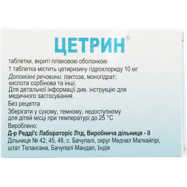 | Ingredients | 1 tablet contains cetirizine hydrochloride 10 mg |