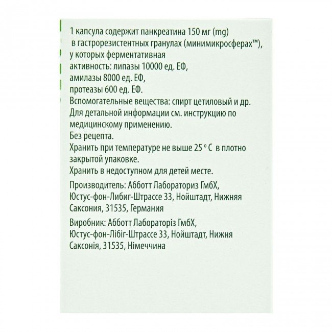 | Ingredients | 1 capsule contains 150 mg of pancreatin in gastro-resistant granules (minimicrospheres™), which have enzymatic activity: lipase 10,000 units. EF, amylase 8000 units. EF, protease 600 units. EF |
