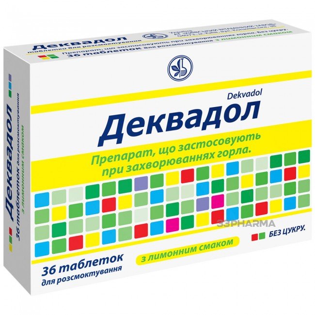 Dekvadol is a medication for the local treatment of acute inflammatory diseases of the oral cavity and throat, including gingivitis, ulcerative and aphthous stomatitis, tonsillitis, laryngitis, and pharyngitis. Decvadol is also recommended for use in cases of bad breath.
