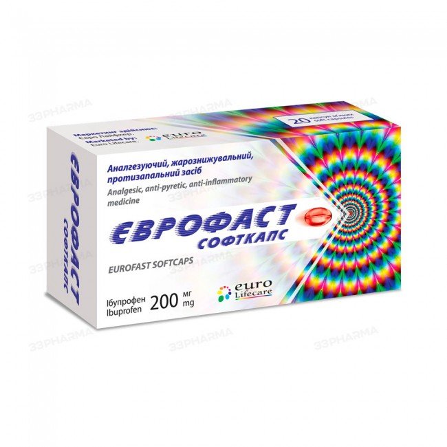 Eurofast Softcaps – Eurofast Softcaps are designed for the symptomatic treatment of mild to moderate pain of various origins (including headaches, toothaches, and menstrual pain), as well as fever and cold symptoms. This medication contains ibuprofen, a nonsteroidal anti-inflammatory drug (NSAID) with analgesic, anti-inflammatory, and antipyretic properties.