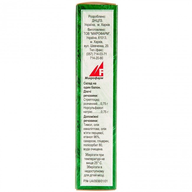 | Ingredients | 1 bottle contains soluble streptocide 0.75 g, sodium sulfathiazole hexahydrate 0.75 g, thymol, peppermint oil, eucalyptus oil, glycerin, ethanol 96%, polysorbate 80, sucrose, purified water. |
