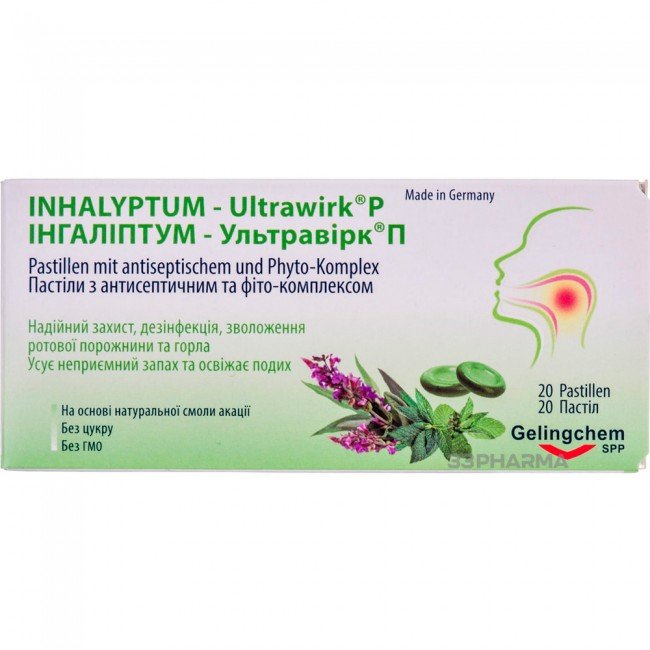 Inhalyptum-Ultravirk Lozenges contain the antiseptic complex Multiwirk® and the phyto-complex Inhalyptum®. They contribute to the disinfection and prevention of cold diseases of the oral cavity and throat, help restore the mucous membrane after dental procedures, and prevent the development of caries and halitosis (bad breath).