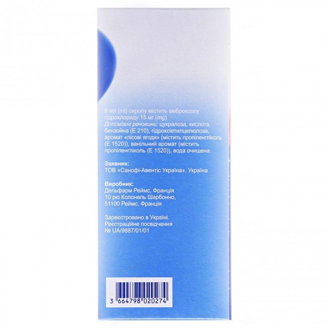 INGREDIENTS: ACTIVE: 5 ml of syrup contain ambroxol hydrochloride 15 mg INACTIVE: sucralose, benzoic acid (E 210), hydroxyethylcellulose, flavor "forest berries" (containing propylene glycol (E 1520)), vanilla flavor (containing propylene glycol (E 1520)), purified water