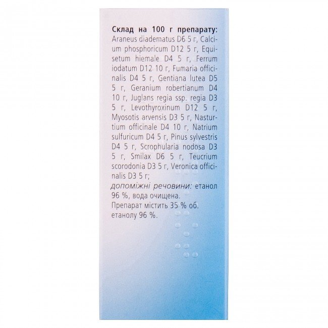 INGREDIENTS: ACTIVE: Araneus diadematus D6 , Calcium phosphoricum D12, Equisetum hiemale D4 , Ferrum іodatum D12 , Fumaria officinalis D4 , Gentiana lutea D5 , Geranium robertianum D4, Juglans regia ssp. regia D3 , Levothyroxinum D12 , Myosotis arvensis D3, Nasturtium officinale D4 , Natrium sulfuricum D4 , Pinus sylvestris D4 , Scrophularia nodosa D3 , Smilax D6 , Teucrium scorodonia D3 , Veronica officinalis D3