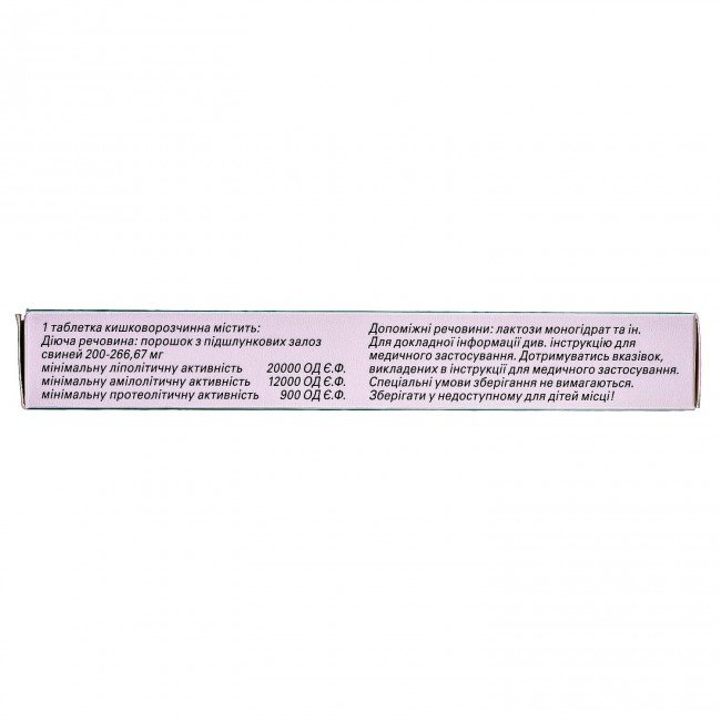 INGREDIENTS: 1 enteric tablet contains powder from the pancreas of pigs 160-222.22 mg, which has a minimum lipolytic activity of 20,000 EU units (European Pharmacopoeia units), a minimum amylolytic activity of 12,000 EU units, a minimum proteolytic activity of 900 EU units