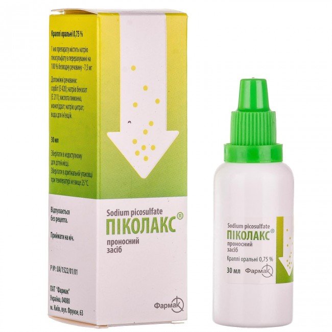 Picolax is a drug from the laxative group. Picolax contains an active component - sodium picosulfate, which is metabolized in the large intestine to form a pharmacologically active form - diphenol. The laxative affects the receptors of the mucous membrane of the large intestine, as a result of which peristalsis and the movement of feces through the large intestine are enhanced