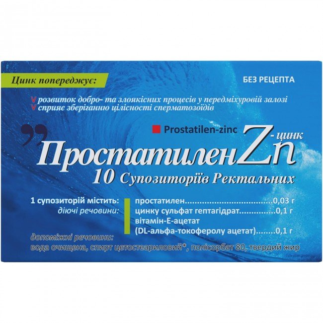 Prostatilen-zinc is a combination drug used to treat prostate diseases. prostatilen, which is part of the suppositories, has an organotropic effect on the prostate gland (prostatoprotective effect), an anti-inflammatory effect, reducing swelling and leukocyte infiltration of the gland, improves microcirculation processes and platelet-vascular hemostasis, and has a positive effect on the functional activity of sperm. prostatilen also stimulates the activity of the humoral immune system and some factors of the body's resistance, affects the tone of the bladder muscles, including the tone of the detrusor.