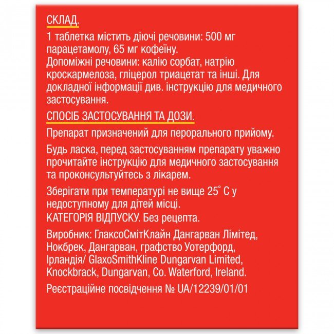 | Ingredients | paracetamol 500 mg, caffeine 65 mg, pregelatinized starch, corn starch, povidone, potassium sorbate, talc, stearic acid, croscarmellose sodium, hypromellose, glycerol triacetate |