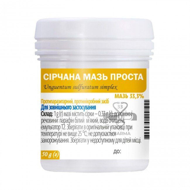 Sulfur ointment is a dermatological medicinal product containing 33% precipitated sulfur on a vaseline emulsion base. Used externally to treat skin diseases: seborrhea, sycosis, psoriasis, mycosis (fungal skin diseases), etc.