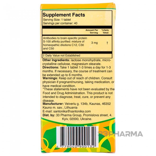 Active ingredients. antibodies to the brain-specific protein S-100, affinity-purified: a mixture of homeopathic dilutions C12, C30, and C50 – 3 mg.