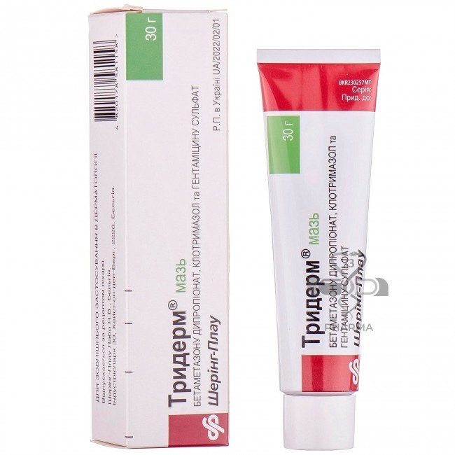 Triderm is a branded Belgian hormonal drug that contains betamethasone dipropionate, gentamicin and clotrimazole. A combined drug that has antiallergic, anti-inflammatory, antipruritic, antiexudative (limites secretions from tissue vessels), antifungal and antibacterial effects.