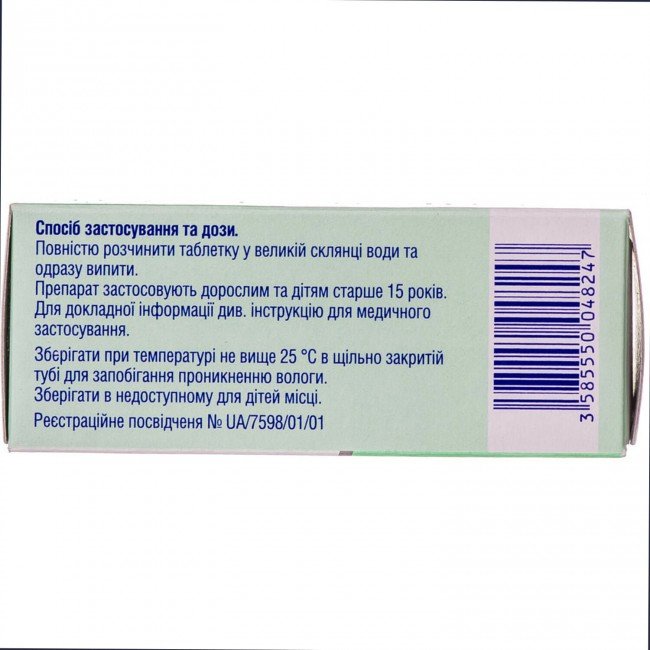 | Ingredients | acetylsalicylic acid - 330 mg; ascorbic acid (vitamin C) - 200 mg. sodium bicarbonate, anhydrous citric acid, povidone, sodium benzoate (E 211) |