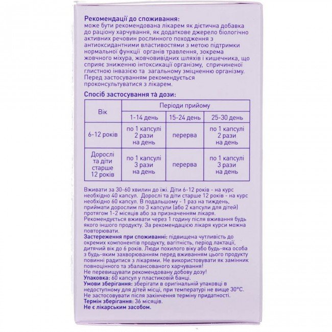 - 6-12 years old. Days 1-14 - one capsule 2 times a day 30-60 minutes before meals; 15-24 days - stop taking; Day 25-30 - 1 capsule 2 times a day 30 - 60 minutes before meals